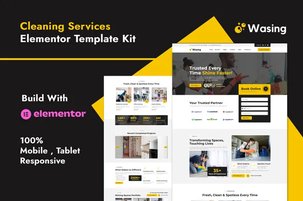 Wasing Cleaning Services is built with Elementor, offering pre-designed pages for home, services, about, pricing, team, blog, and contact. Fully responsive and SEO-optimized, this template kit ensures your cleaning service website looks professional on all devices and ranks well in search engines to attract potential clients.